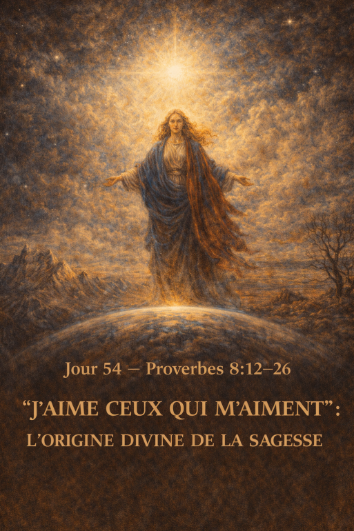 🕊️ Jour 54 — Proverbes 8 : 22–26 “La Sagesse Précède Tout l’Or” : L’Origine Divine de la Sagesse 📘 Résumé du Jour 53 Dans Proverbes 8 : 17–21, la sagesse a promis d’aimer ceux qui l’aiment, de se révéler à ceux qui la cherchent, et de les enrichir de biens durables, de justice et de paix. Elle a montré que sa richesse dépasse l’or et remplit les trésors de sens et de stabilité. ⸻ 📖 Texte biblique « L’Éternel […]