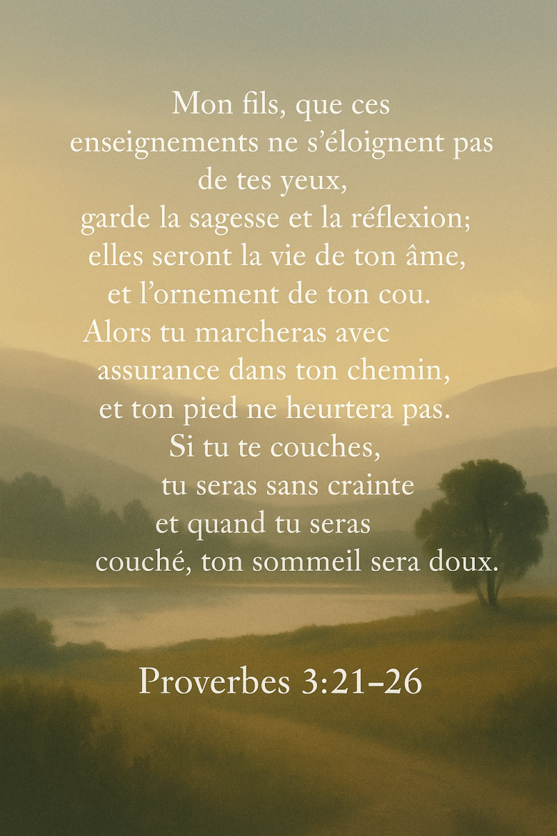 🎯 Clé du jour : La sagesse garde le cœur en paix au milieu des tempêtes — car celui qui s’appuie sur Dieu dort en sécurité, même quand le monde tremble.