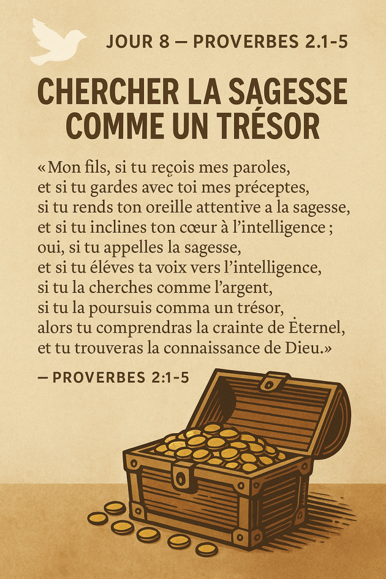 Le chapitre 2 s’ouvre avec une succession de si qui décrivent une quête résolue. La sagesse ne s’impose pas ; elle se reçoit, se garde, s’écoute, se demande et se cherche. Salomon n’invite pas à une curiosité passagère, mais à un engagement profond : “si tu la poursuis comme un trésor.” Autrement dit, la valeur de la sagesse se révèle à ceux qui y investissent du temps, de l’attention et du désir.